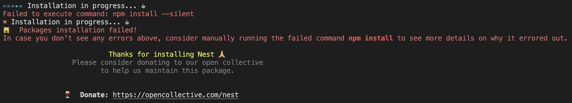 NestJS 의 새로운 프로젝트를 생성하는 과정에서 에러가 발생했다. 이전에는 잘만 됐었는데, 환경을 바꾼 것도 아닌데 왜 이럴까 의아했다.